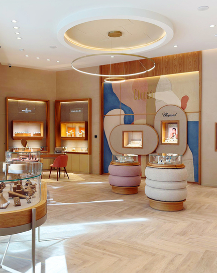 La nueva boutique, ubicada en la planta 0, dispone de una amplia superficie comercial de 90m2 cuya distribución ofrece a los visitantes una excepcional panorámica del punto de venta. Invita a entrar. Ha sido proyectada siguiendo las directrices del estudio de arquitectura y diseño Ujo+Partners. Un espacio ideado sobre una estética actual, limpia y elegante que evoca sutilmente el universo femenino. La base de la decoración es la madera en tonalidad clara, en perfecta sintonía con una gama cromática muy equilibrada, apreciada en las telas de suaves colores pastel lisos como beiges y cremas, así como rosasy delicados tonos salmón que, junto al mobiliario de formas redondeadas, transmiten una atmósfera cálida y cercana, seña de identidad de Chocrón.Este nuevo Shop-in-Shop, cuya apertura coincide con el 75 aniversario de la reconocida Maison joyera, alberga colecciones emblemáticas de la marca como Bubbles o Link, así como algunas de las prestigiosas firmas relojeras que Chocrón ya distribuye en sus otras boutiques. Con dos espaciosas mesas de venta en forma oval, así como con sus vitrinas y expositores diáfanos estratégicamente iluminados en los que joyas y relojes son los auténticos protagonistas, el resultado es un concepto de diseño moderno y abierto que permite la entrada de luz y una magnífica visibilidad de las colecciones desde cualquier ángulo.